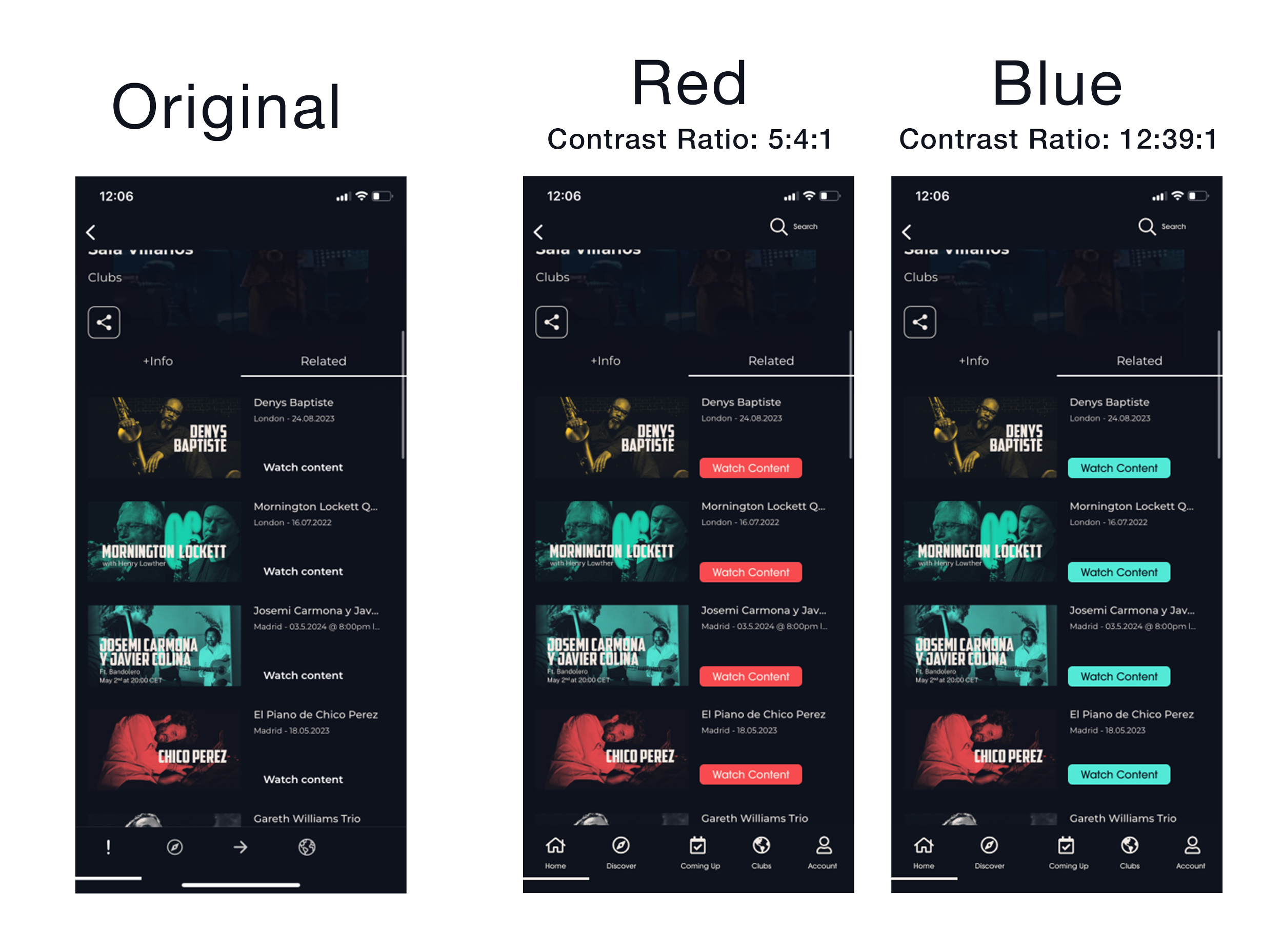 Oh! Jazz’s off-white has the highest contrast ratio which is great for the text. Regarding the button color, given that blue has a much higher contrast ratio and passes both tests, we are opting for blue as our button color instead of red.